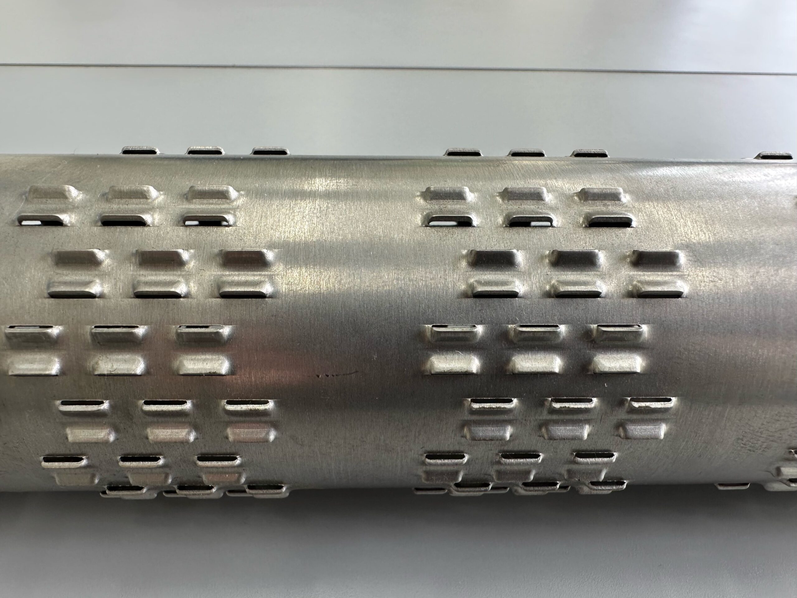 こちらは、マフラー向けのルーバーパイプです。板巻きパイプの表面にルーバーと呼ばれる突起成形を行ったパイプです。板の状態でルーバー加工を行い、板巻きパイプに加工するのですが、通常のローラーでは折角成形したルーバーが潰れてしまう為、特殊なローラーで成形を行っております。当社ではパンチング孔の板巻きパイプだけではなく、突起などの成形のある板巻きパイプも製作できる可能性がございます。標準納期は1.5週間からです。